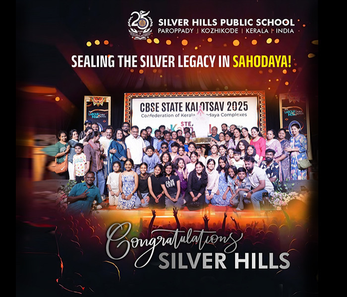 Silver Hills Public School, Kozhikode has made its 25th anniversary celebrations even more special by retaining the top position in the state-level CBSE Sahodaya Complex School Kalolsavam. The school's outstanding performance earned a total of 202 points, securing the coveted Gold Cup and upholding the reputation as a hub of excellence.